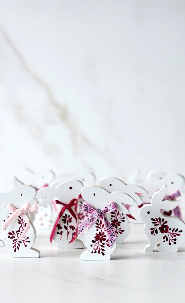 Figuras madera ..conejos pintados a mano y con detalles de cintas en tela