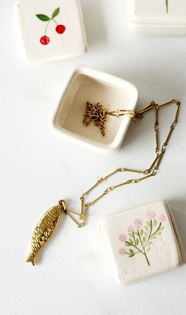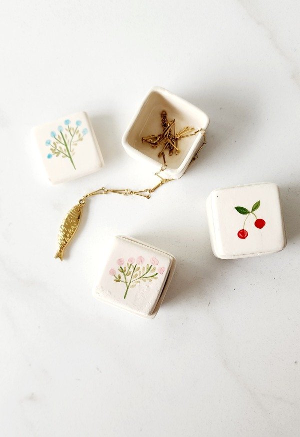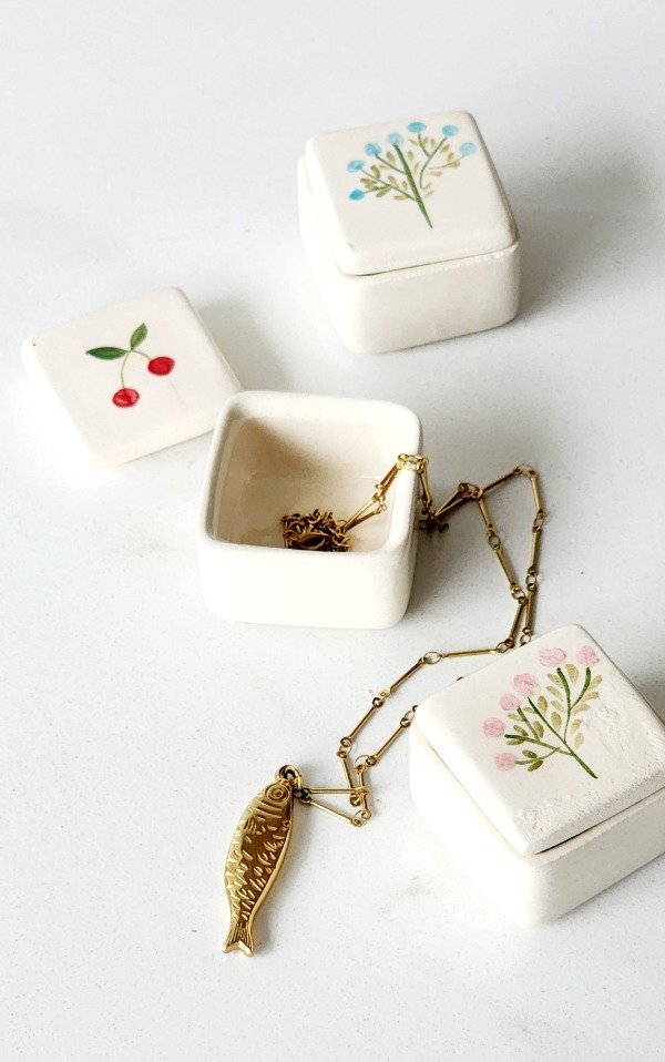 Mini joyerito en cerámica con detalle de flores o cerecitas ..los diseños son aleatorios medida aprox de cada uno 4 xm x 4 cm