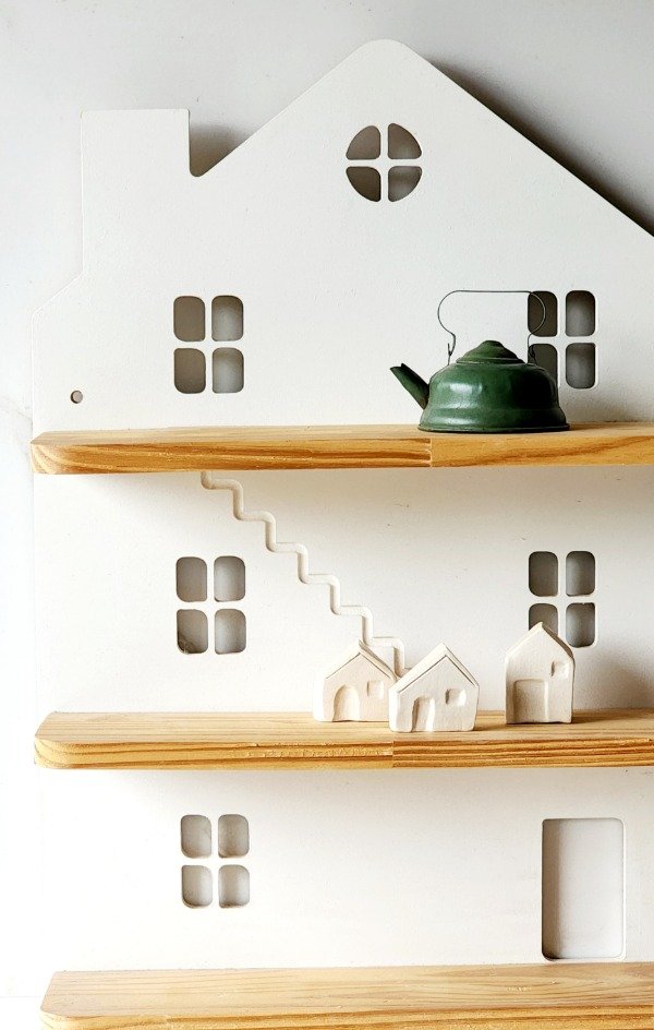 Casita de madera con tres estantes para apoyar o colgar ..con ventanitas caladas ..