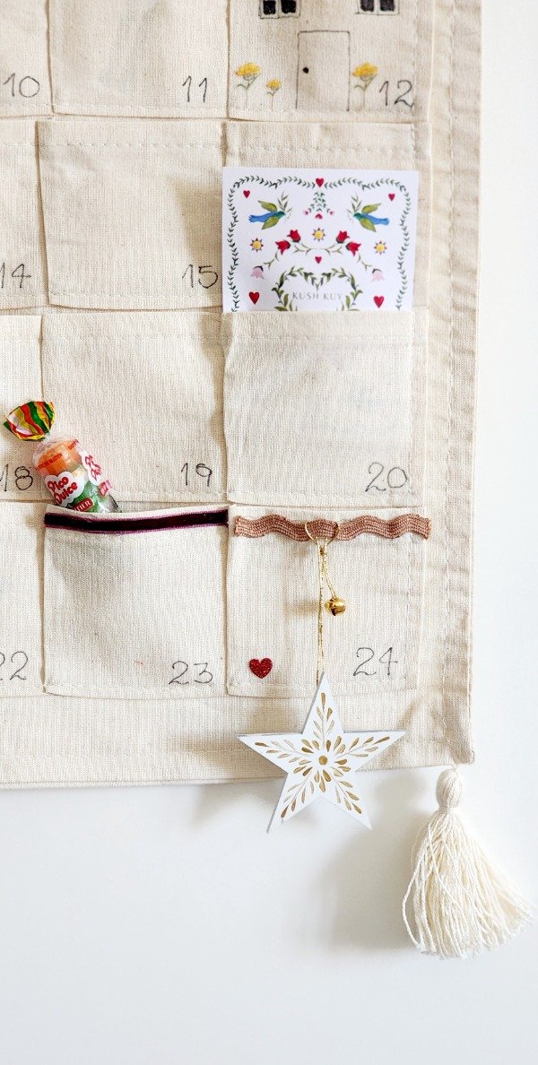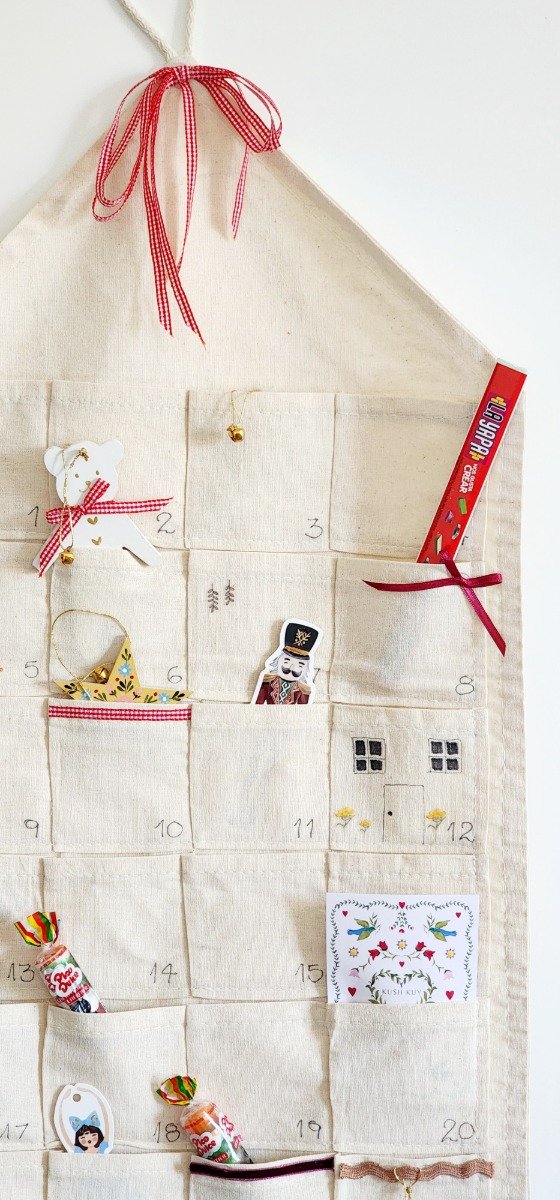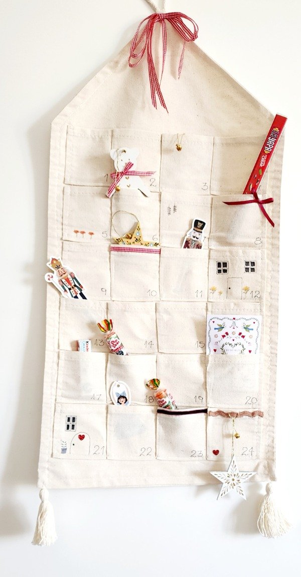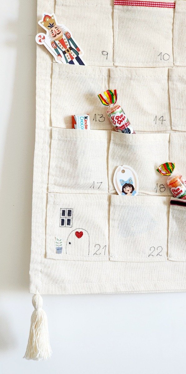 Calendario adviento con 24 bolsillos realizado en lienzo natural ..tra e 3 adornitos de madera ..tags exclusivos y targeta ilustrada..además de golosinas ..moño ..y borlas hilo natural mide 60 cm x 31 cm aprox