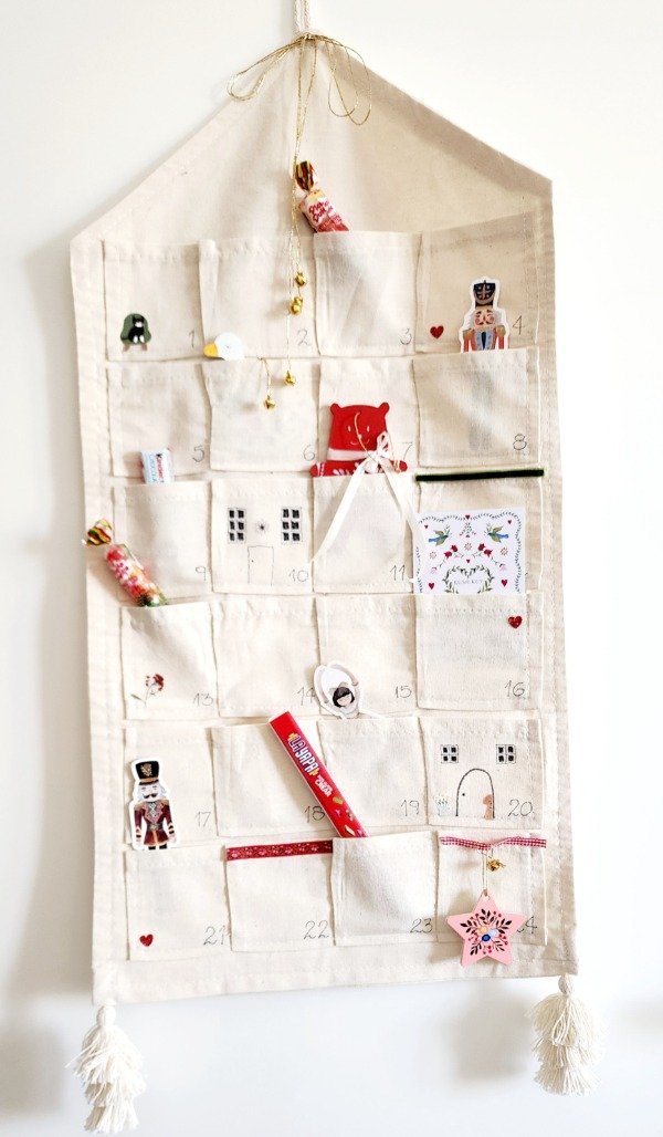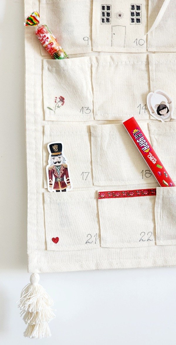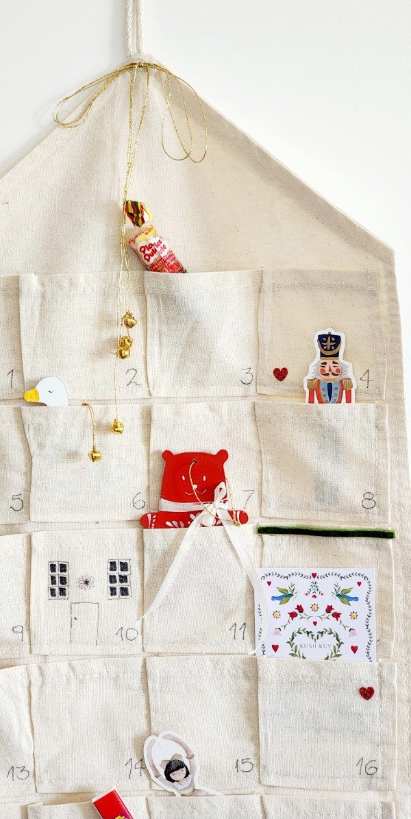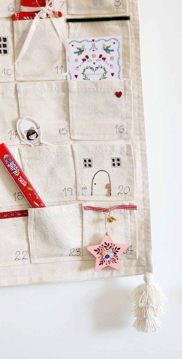 Calendario adviento con 24 bolsillos realizado en lienzo natural ..tra e 3 adornitos de madera ..tags exclusivos y targeta ilustrada..además de golosinas ..moño ..y borlas hilo natural mide 60 cm x 31 cm aprox