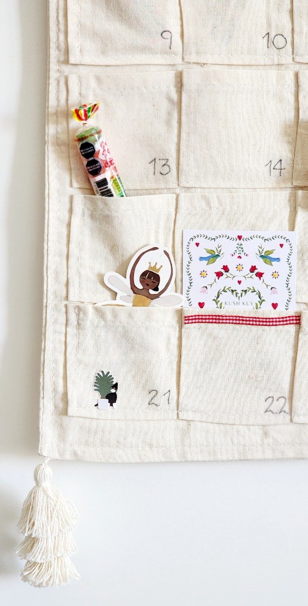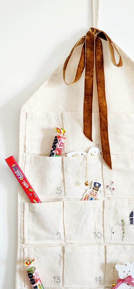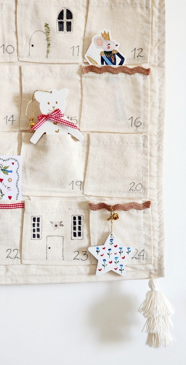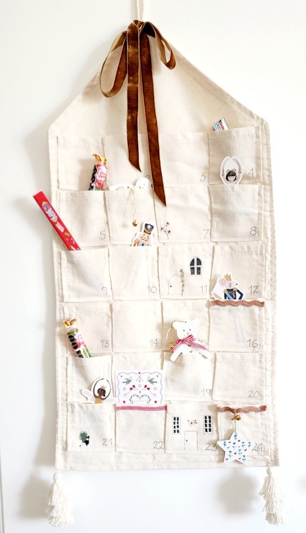 Calendario adviento con 24 bolsillos realizado en lienzo natural ..tra e 3 adornitos de madera ..tags exclusivos y targeta ilustrada..además de golosinas ..moño ..y borlas hilo natural mide 60 cm x 31 cm aprox