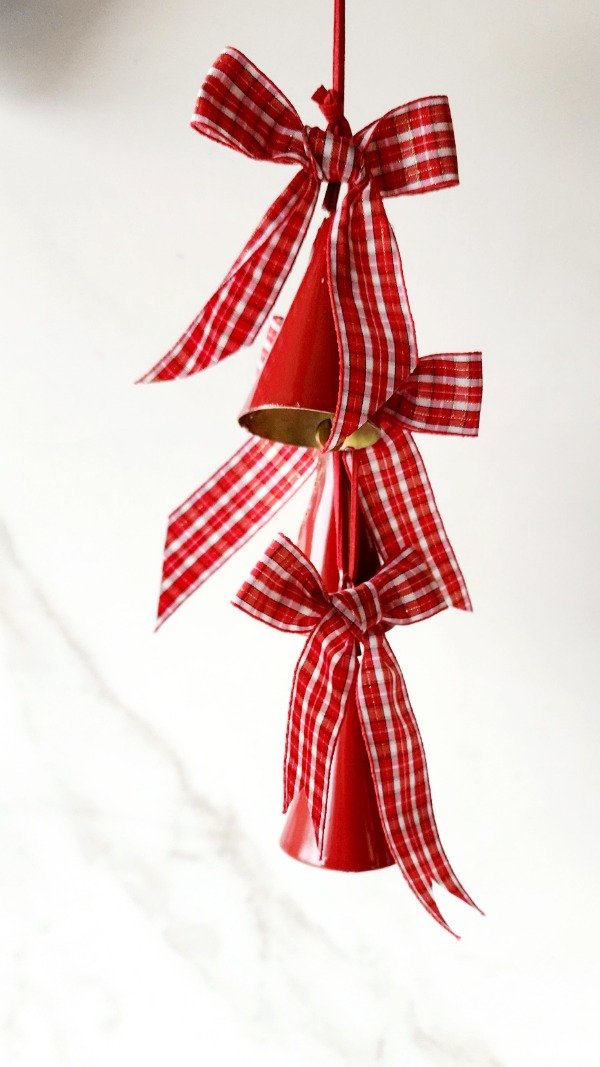 Campanita mediana metal color cerezo tamaño aprox 7 cm con moño tela cuadrille rojo /lurex y lazo gamuza a tono largo total 12 cm EL PRECIO ES POR UNIDAD