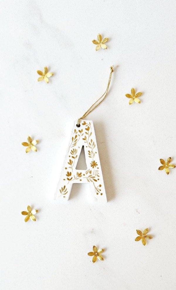 Inicial madera pintadas a mano con detalle de hilo de lurex para colgar en el árbol..para personalizar un regalo ..la deco más linda !
