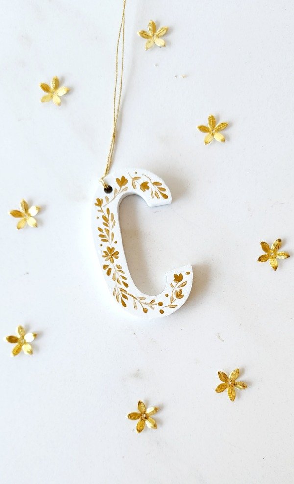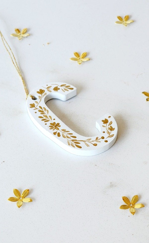 Inicial madera pintadas a mano con detalle de hilo de lurex para colgar en el árbol..para personalizar un regalo ..la deco más linda !