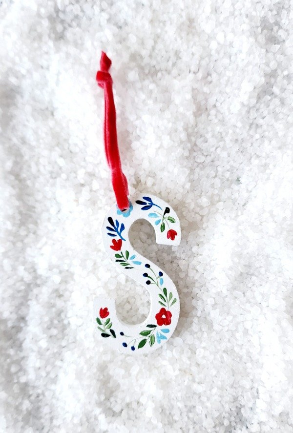 Inicial madera pintadas a mano con detalle de cinta en terciopelo pra colgar en el árbol..para personalizar un regalo ..la deco más linda !