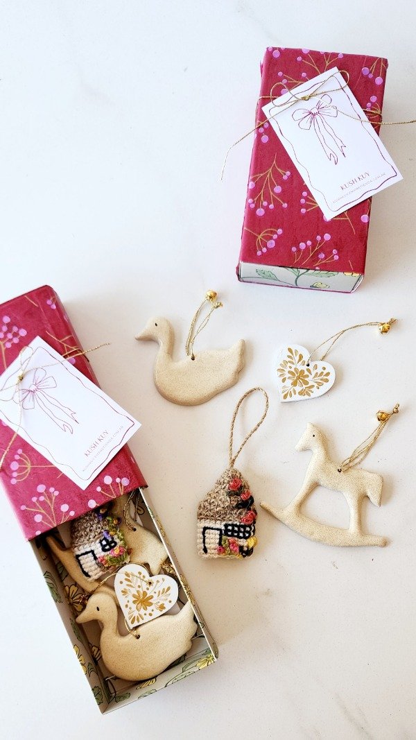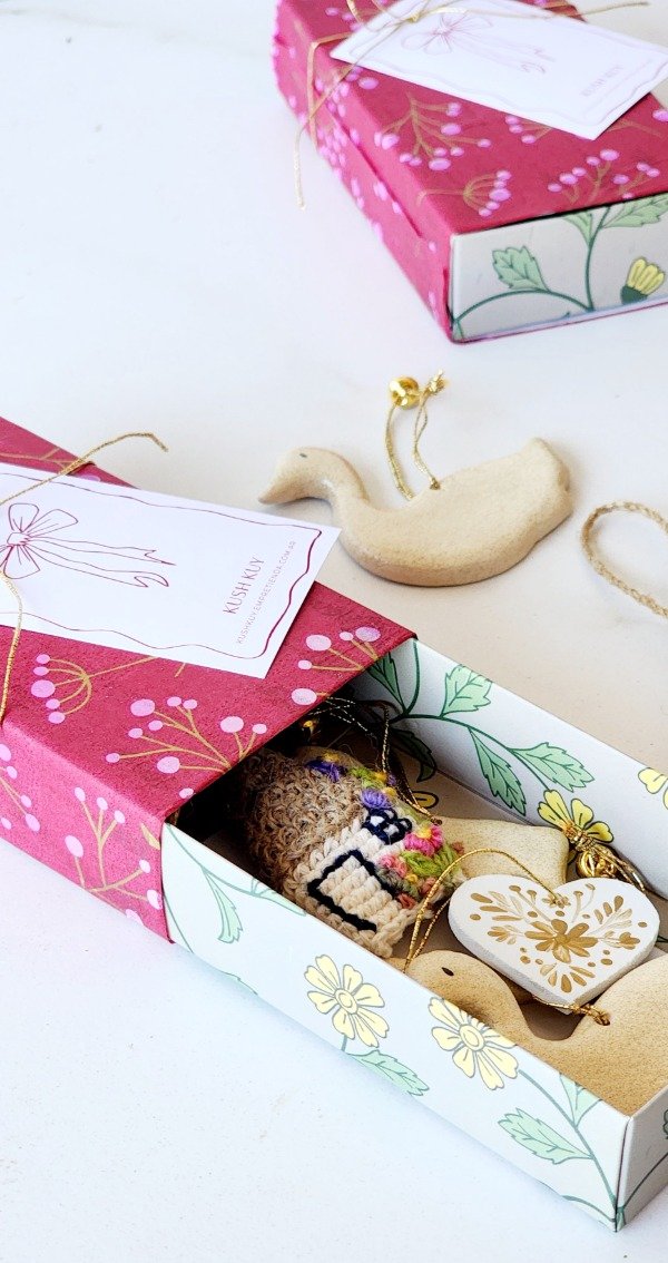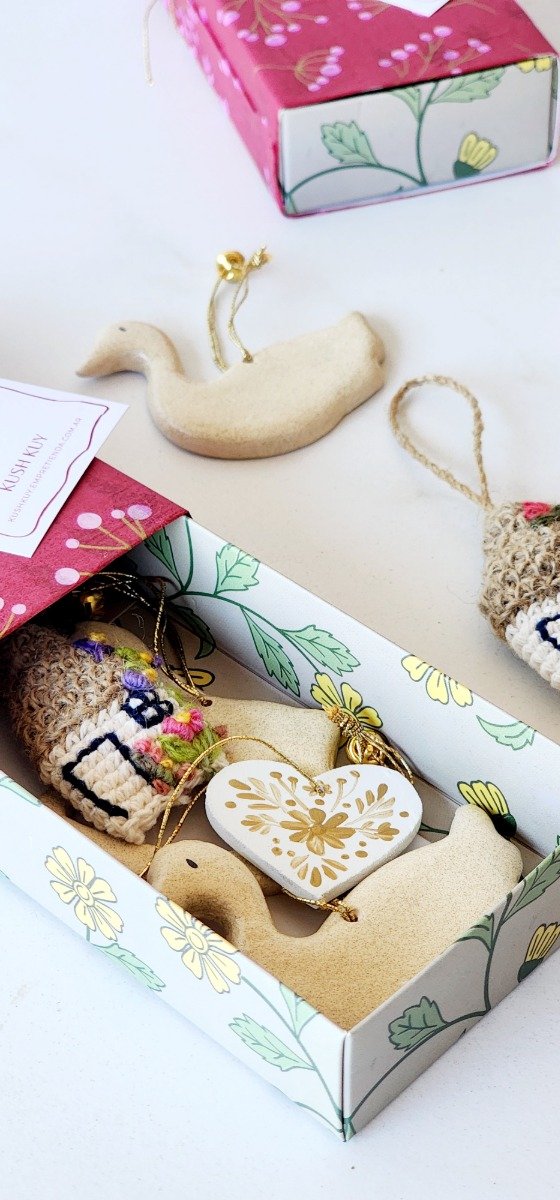 Cajita especial que contiene 2 piezas en cerámica ( caballo y patito) 1 casita tejida al crochet bordada y un corazón de madera