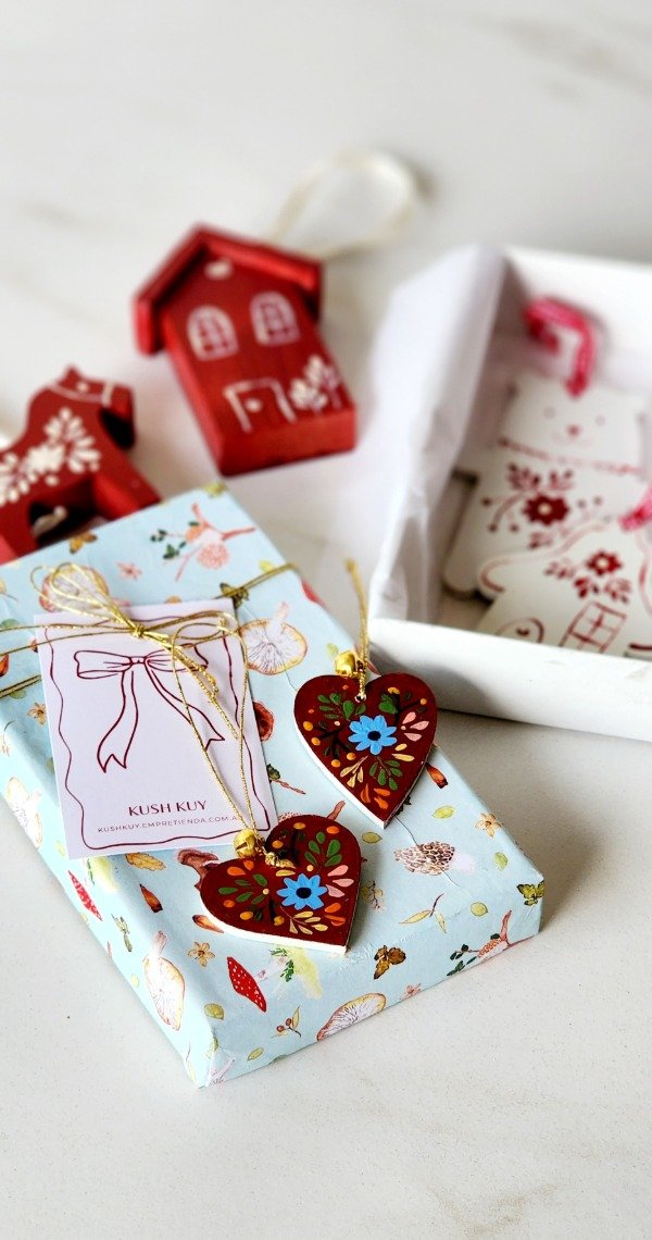 Cajita forrada con 6 adornitos midi en madera medida aprox de los adornitos 6 cm / 8 cm