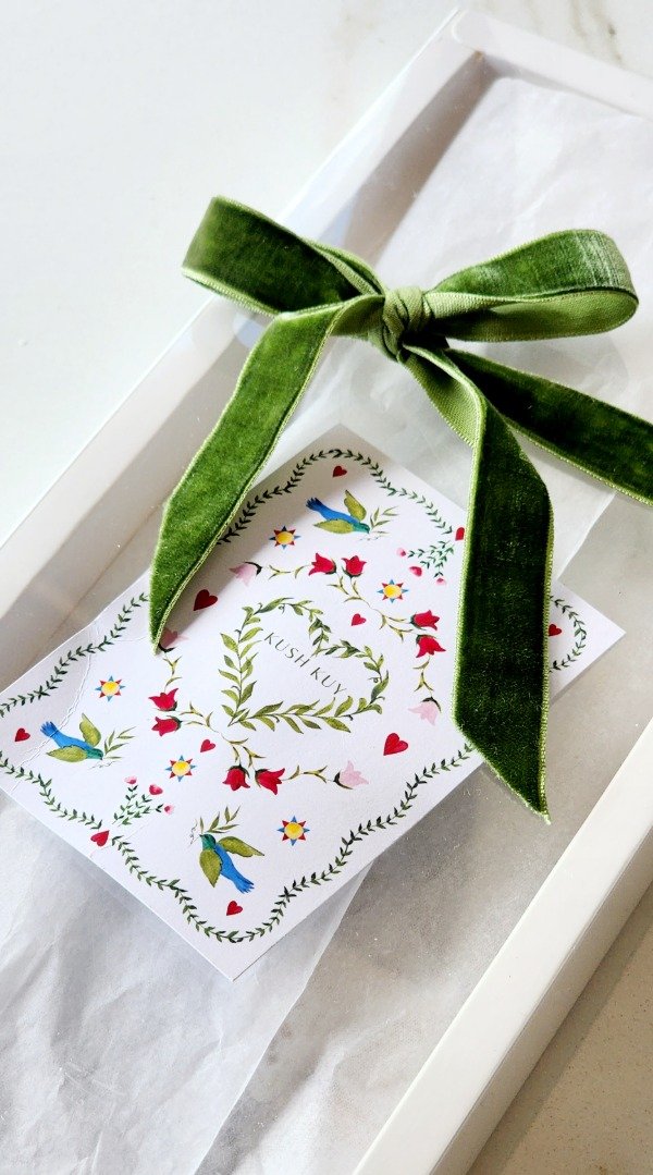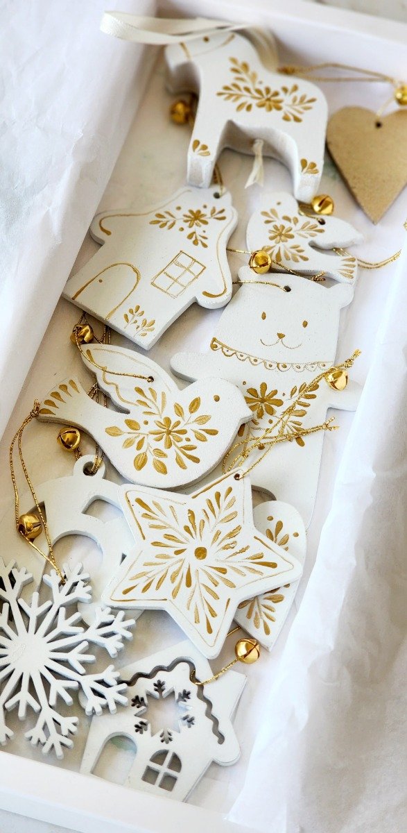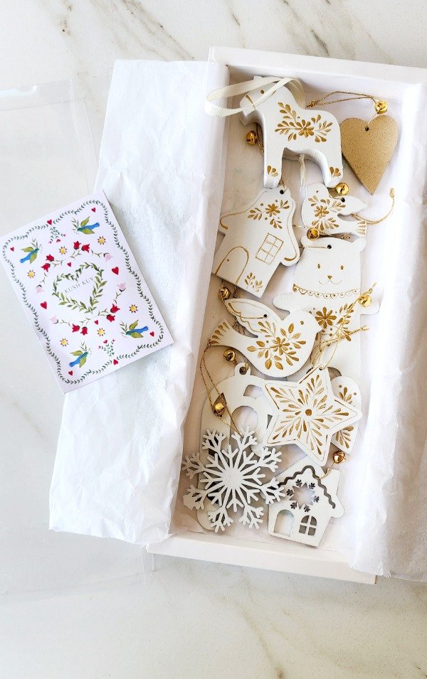 Caja con 11 adornitos en madera pintados a mano con hilo de lurex y mini cascabeles cinta de terciopelo y targeta ilustrada