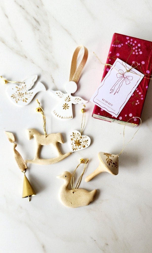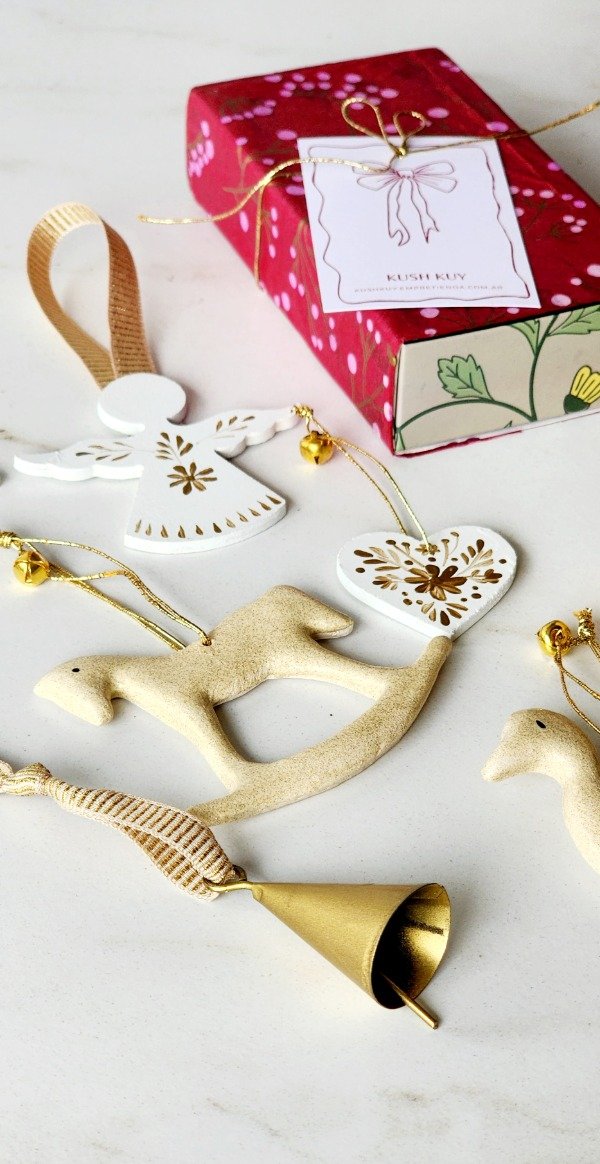 Cajita de los tesoros..contiene 7 adornitos en madera,cerámica y campanita con detalles de cintas e hilo de lurex ..mini cascabeles vienen presentados en una hermosa cajita craft para que puedas guardarlos o regalar ♡
