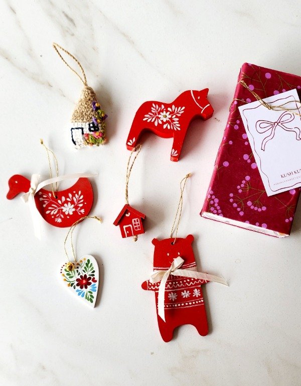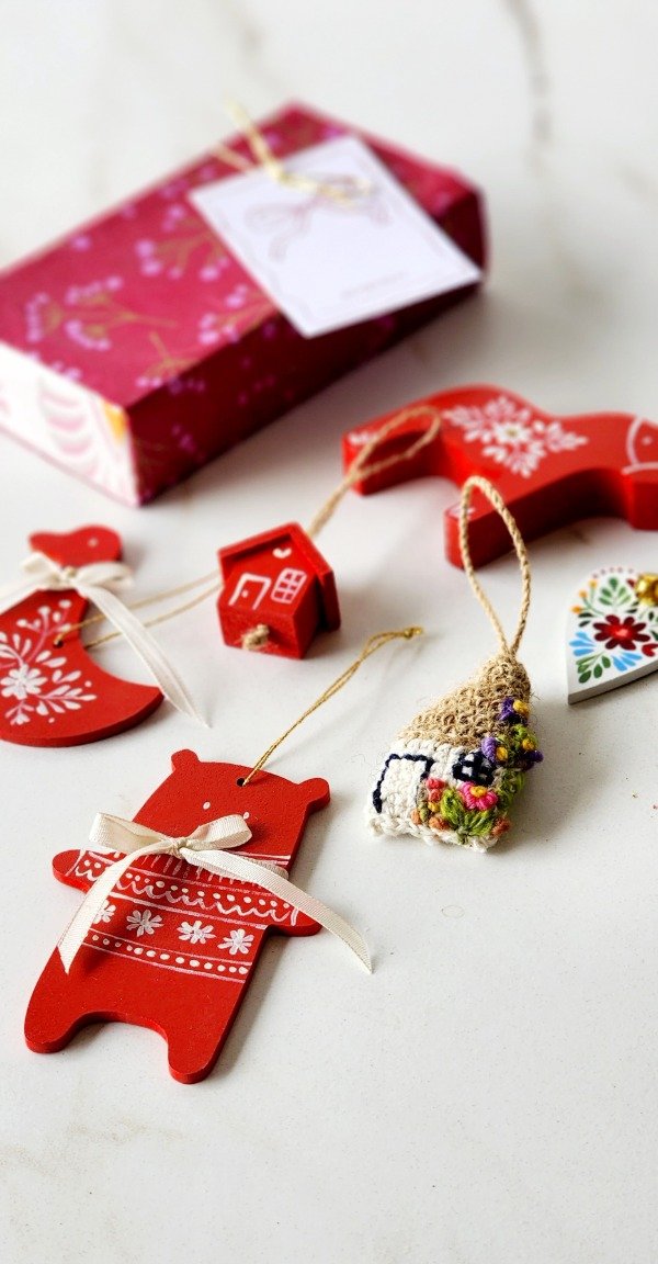 Cajita de los tesoros..contiene 7 adornitos en madera,cerámica y casita tejida al crochet bordada con detalles de cintas e hilo de lurex ..mini cascabeles vienen presentados en una hermosa cajita craft para que puedas guardarlos o regalar ♡