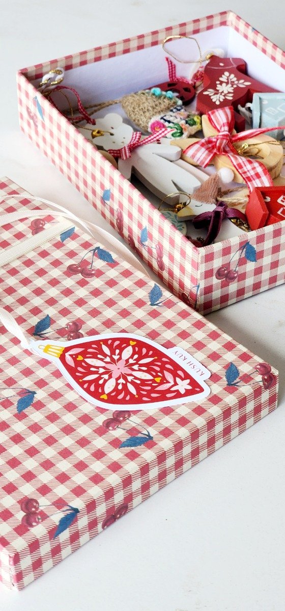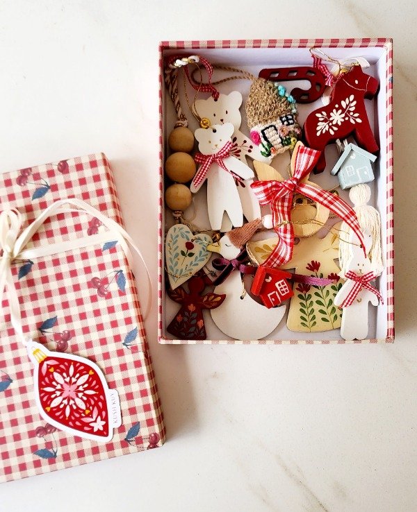 Caja forrada a mano ilustrada de regina ilustraciones con 14 adornitos pintados a mano.casita tejida al crochet y bordada con hilo de lurex mini cascabeles y targeta ilustrada