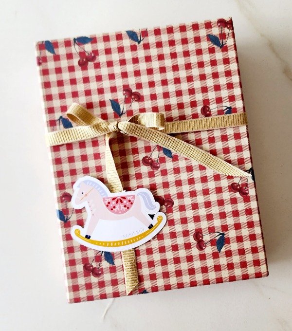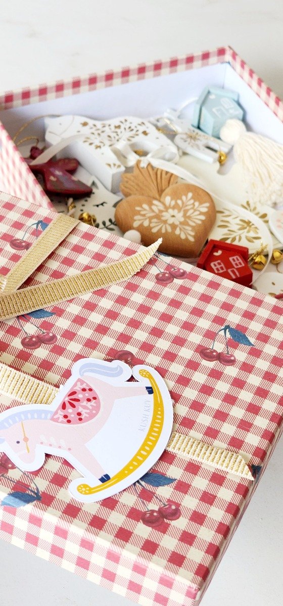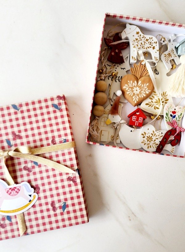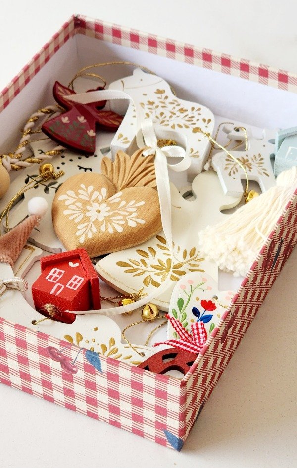 Caja forrada a mano ilustrada de regina ilustraciones con 14 adornitos pintados a mano con hilo de lurex mini cascabeles y targeta ilustrada milagrito tallado a mano