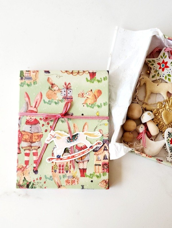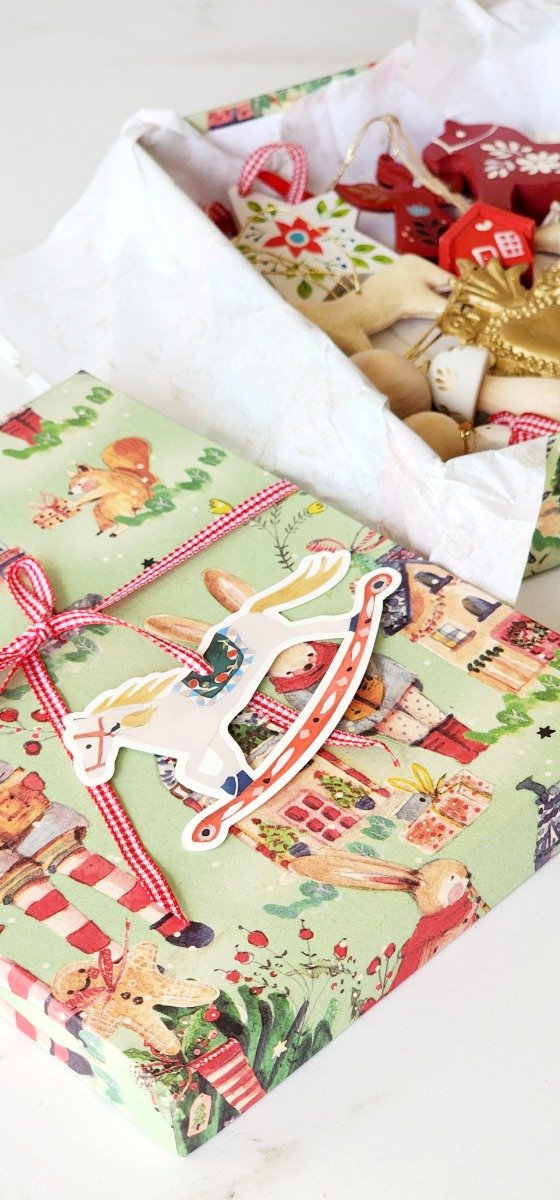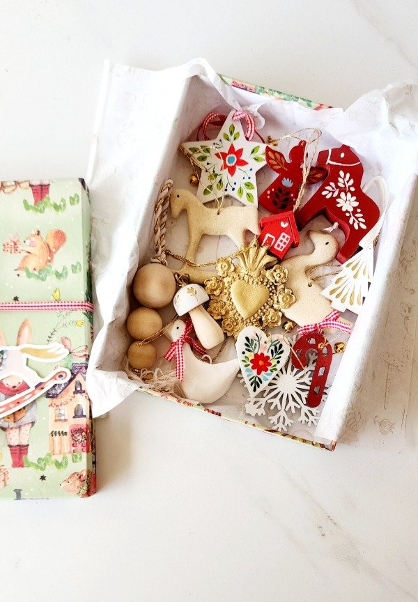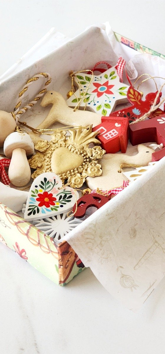 Caja forrada a mano ilustrada de regina ilustraciones con 14 adornitos pintados a mano en madera y cerámica, milagrito metálico ..todos los adornitos con hilo de lurex mini cascabeles y targeta ilustrada