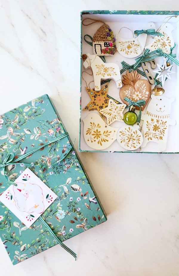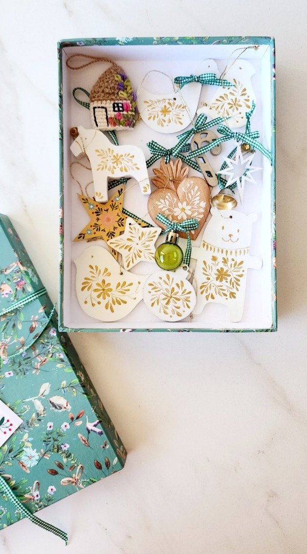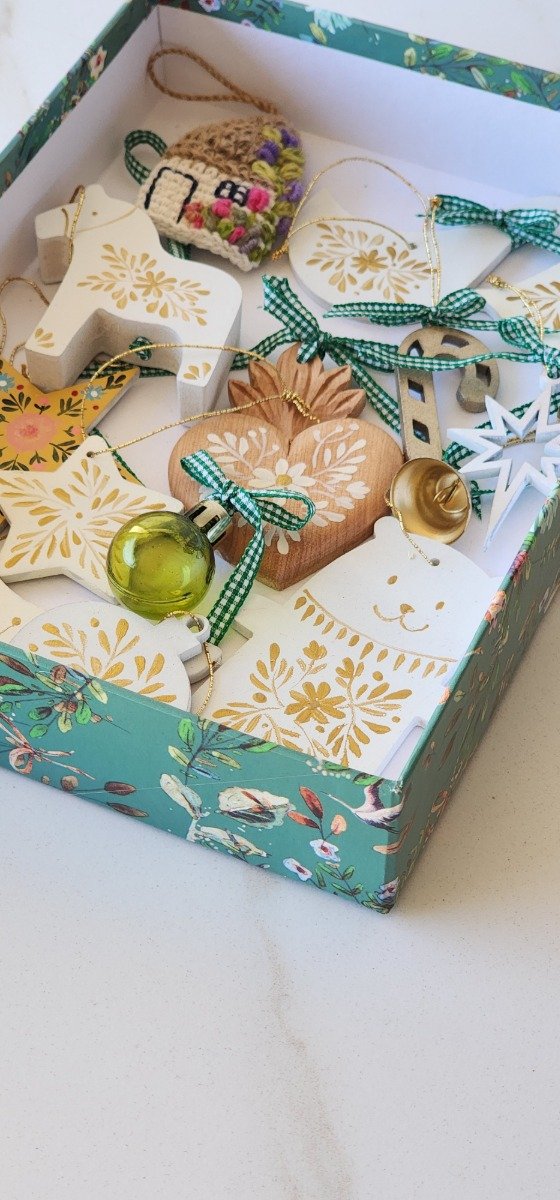 Caja forrada a mano ilustrada de regina ilustraciones con 14 adornitos pintados a mano en madera un milagrito tallado , una casita tejida muy especial hecho a mano ..todos los adornitos con hilo de lurex mini cascabeles y targeta ilustrada