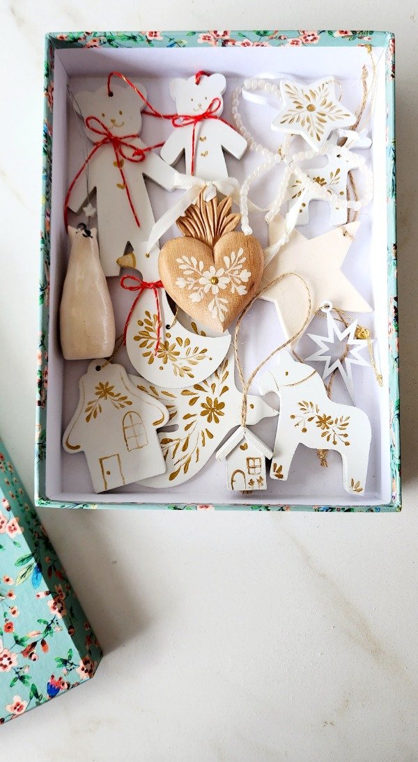 Caja forrada a mano ilustrada de regina ilustraciones con 14 adornitos pintados a mano en madera un milagrito tallado , ..todos los adornitos con hilo de lurex mini cascabeles y targeta ilustrada