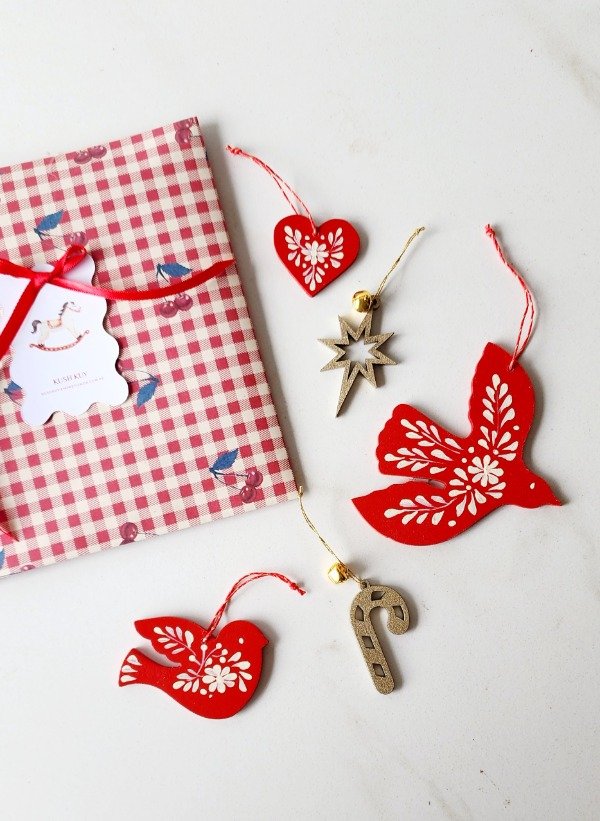 5 figuras en madera pintadas a mano en un bello sobre papel ilustrado