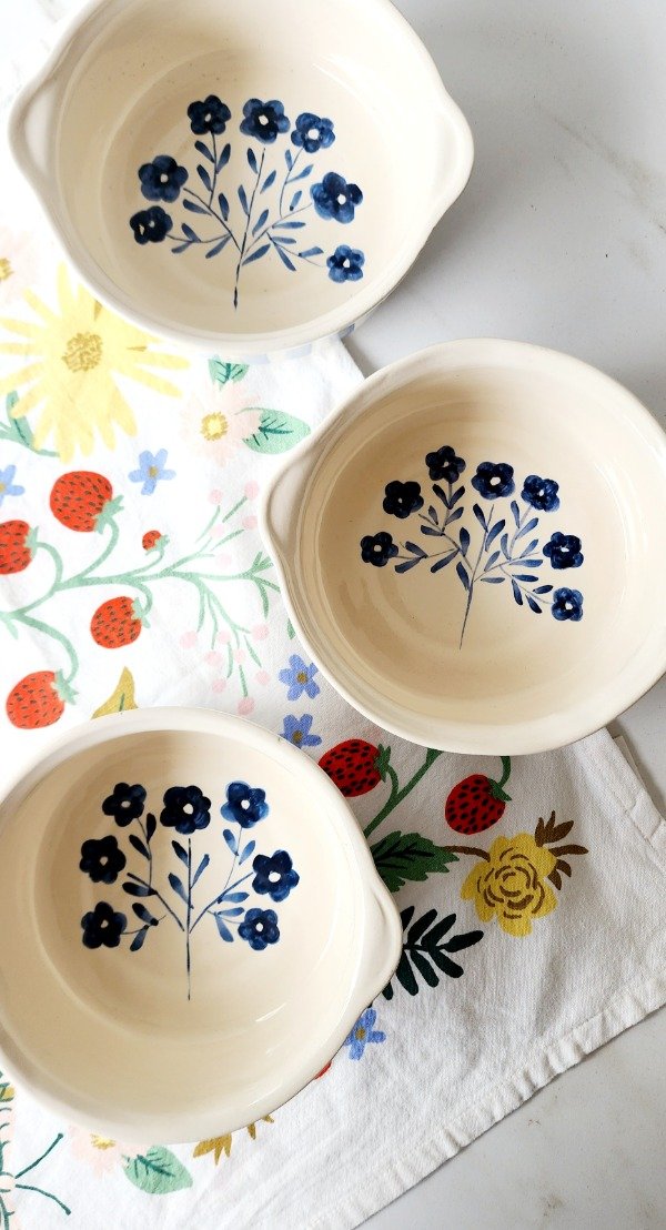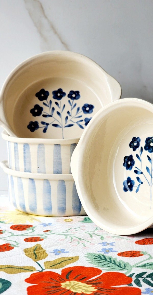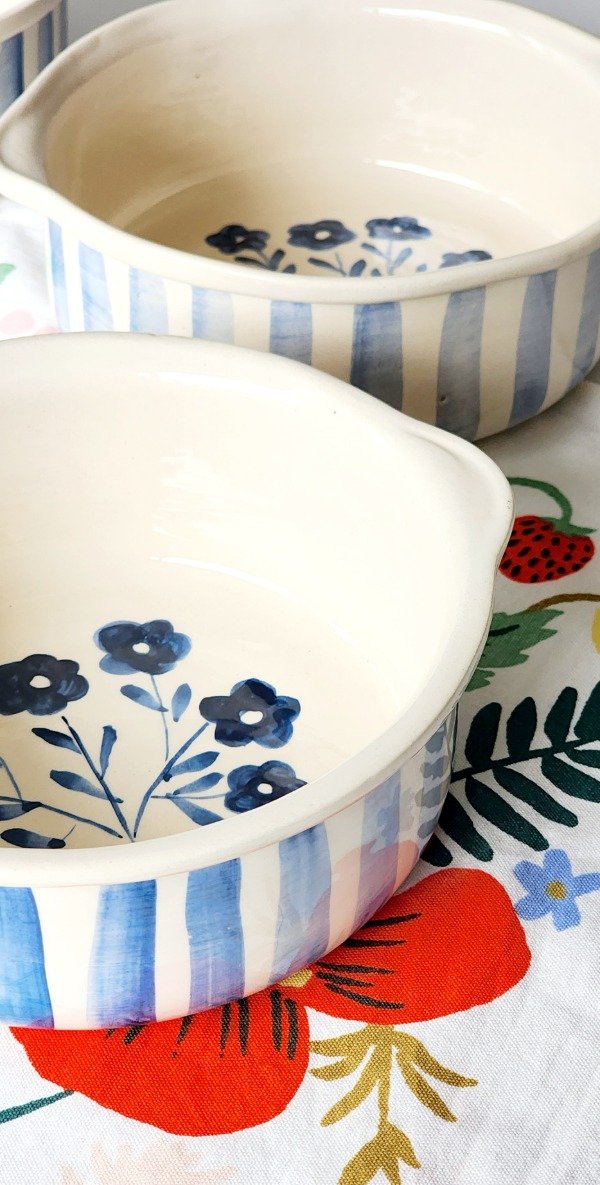 Cazuela exterior a rayas ..interior ramillete azul medida 18 cm de diámetro x 6 cm alto