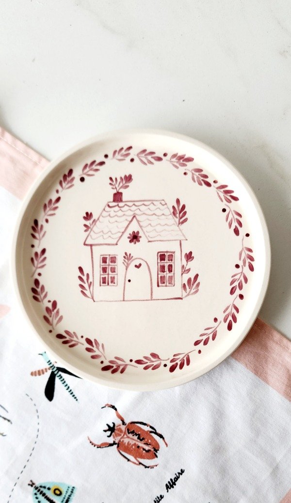 Plato 19 cm de diámetro con borde alto de 2 cm ..diseño exclusivo casita color cerezo