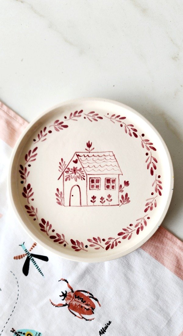 Plato 19 cm de diámetro con borde alto de 2 cm ..diseño exclusivo casita color cerezo